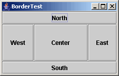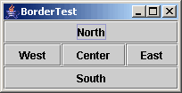 // File : layouts/borderLayout/BorderTest.java // Purpose: Demo use of BorderLayout. // Author : Fred Swartz - 2006-09-24 - Placed in public domain. import java.awt.*; import javax.swing.*; ///////////////////////////////////////////////// class BorderTest class BorderTest extends JFrame { //======================================================= main public static void main(String[] args) { JFrame window = new BorderTest(); window.setVisible(true); } //================================================ constructor BorderTest() { //... Create components (but without listeners) JButton north = new JButton("North"); JButton east = new JButton("East"); JButton south = new JButton("South"); JButton west = new JButton("West"); JButton center = new JButton("Center"); //... Create content pane, set layout, add components JPanel content = new JPanel(); content.setLayout(new BorderLayout()); content.add(north , BorderLayout.NORTH); content.add(east , BorderLayout.EAST); content.add(south , BorderLayout.SOUTH); content.add(west , BorderLayout.WEST); content.add(center, BorderLayout.CENTER); //... Set window characteristics. setContentPane(content); setTitle("BorderTest"); setDefaultCloseOperation(JFrame.EXIT_ON_CLOSE); pack(); } } |